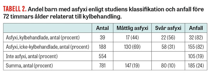 Definitionen av »asfyxi« i studien bestämdes av de intervall för Apgarpoäng vid 5 och 10 minuters ålder som samtliga kylbehandlade barn i studien hade. Apgarpoäng 0–1 vid 5 minuters ålder eller Apgarpoäng <4 vid både 5 och 10 minuters ålder klassificerades som »svår asfyxi«. I övrigt klassificerades Apgarpoäng <6 vid 5 minuters ålder eller <7 vid 10 minuters ålder som »måttlig asfyxi«; högre Apgarpoäng klassificerades som »ej asfyxi«. I studiens definition av »ej asfyxi« ingår Apgarpoäng 6 vid 5 minuters ålder, vilket skulle klassificerats som asfyxi enligt den sedvanliga definitionen [20].