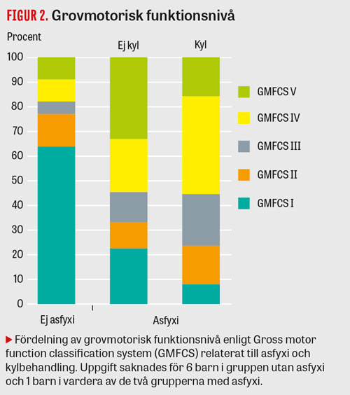 Andelen barn med CP som kan gå (GMFCS I–III) var ca 45 procent bland både kyl- och icke-kylbehandlade barn. En större andel av de icke-kylbehandlade barnen med asfyxi hade dock den högsta motoriska funktionsnivån (GMFCS I), vilket troligen beror på lägre andel med svår asfyxi bland dessa barn snarare än att kylbehandling orsakar skador.