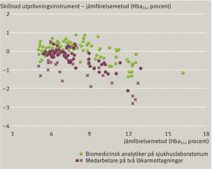 Ett exempel på värdet av att undersöka utrustningen både på ett större laboratorium och bland slutanvändarna visas i Figur1. Medan laboratorieutprövningen av ett HbA1c-instrument visar någorlunda bra resultat jämfört med jämförelsemetoden i mätområdet HbA1c <11 procent, visar resultaten från båda läkarmottagningarna (mest uttalat för den ena) systematiskt lägre värden än jämförelsemetoden, speciellt i mätområdet HbA1c >9 procent. Den ena läkarmottagningen hade dessutom en sämre precision (överensstämmelse mellan resultaten om undersökningen upprepas på samma prov) än den andra (data inte visade).