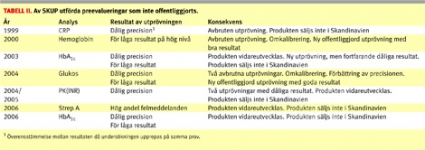 Sju utprövningar stoppades i startfasen, eftersom instrumenten uppvisade dålig kvalitet. I Tabell II redogörs för orsakerna till att dessa utprövningar stoppades. I två av fallen blev produkten förbättrad i efterhand och säljs nu i Skandinavien. I januari 2008 har 67 procent av alla glukosmätare på den norska marknaden (10 av 15) undersökts av SKUP, medan motsvarande siffror för PK(INR) och HbA1c är 96 respektive 100 procent. För CRP, StrepA- och graviditetstest är andelen något lägre: 50 procent, 40 procent respektive 30 procent.