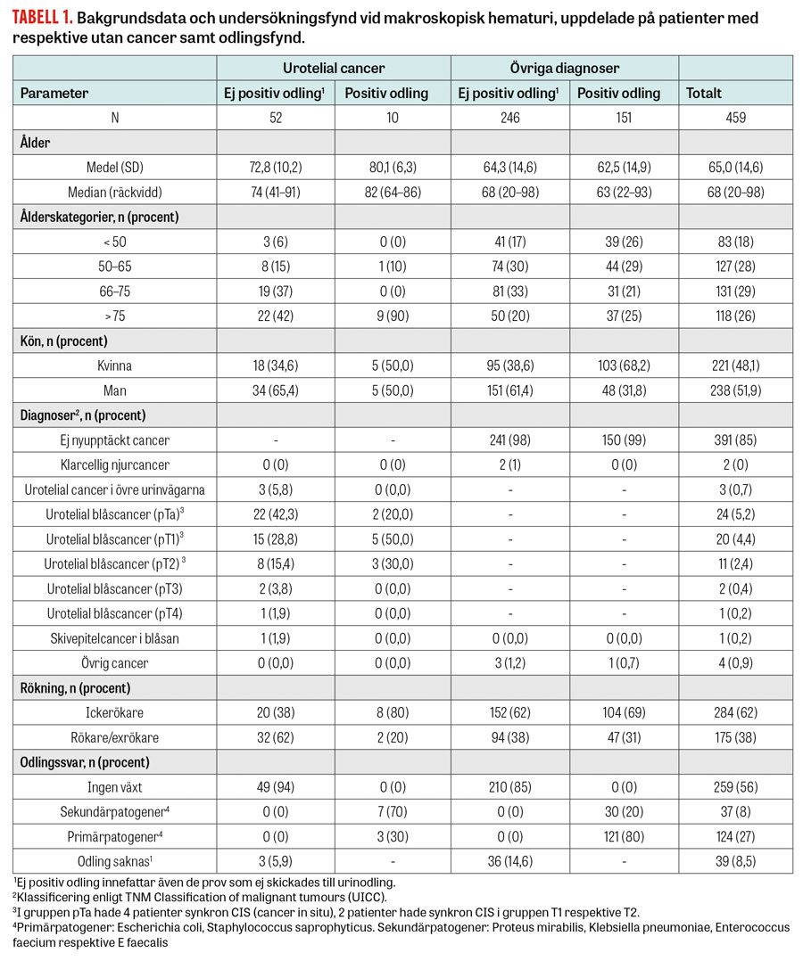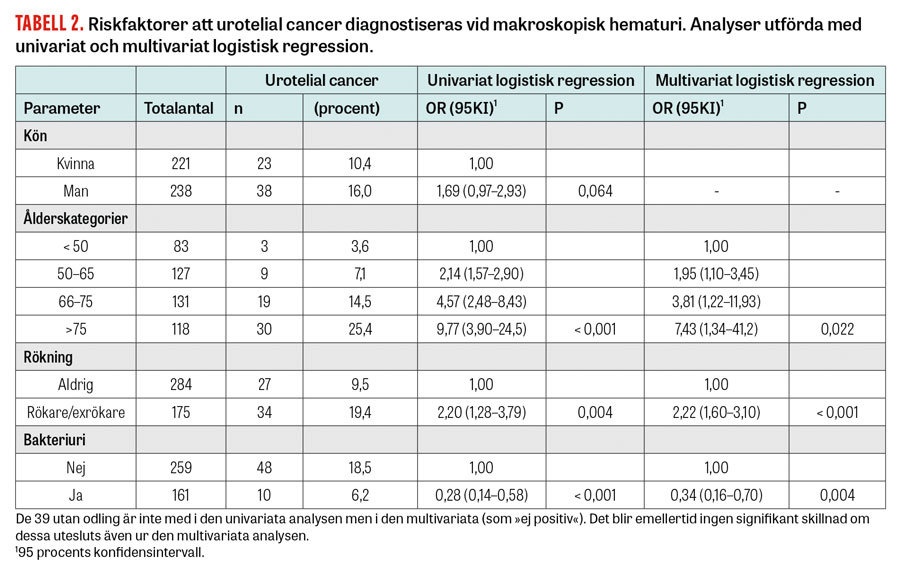 Av 161 patienter med makroskopisk hematuri och samtidig bakteriuri hade 10 patienter (6,2 procent) cancer i urinorganen; alla dessa tumörer var uroteliala och lokaliserade enbart till blåsan. Endast en av dessa patienter var ≤ 75 år. Det prediktiva värdet för urotelial cancer vid makroskopisk hematuri hos patienter ≤ 75 års ålder var alltså signifikant lägre om det samtidigt förelåg bakteriuri, jämfört med om det inte förelåg bakteriuri (< 1 respektive 13,3 procent, P < 0,001). Vid motsvarande jämförelse av patienterna > 75 år blev det ingen signifikant skillnad, och bakteriuri bör således ej betraktas som en riskreducerande faktor att urotelial cancer diagnostiseras hos den åldrade befolkningen (> 75 års ålder). Hos yngre patienter är det dock rimligt att först behandla en eventuell bakteriell hemorragisk cystit och följa upp eventuellt kvarstående hematuri och symtom inför ställningstagande till fortsatt utredning [6].