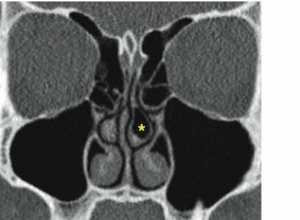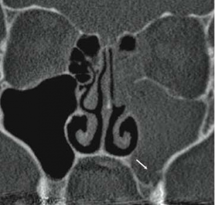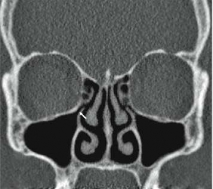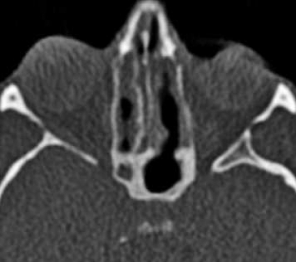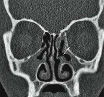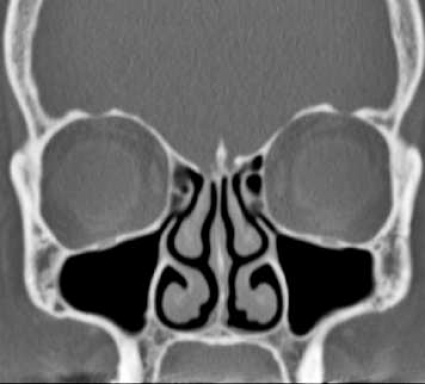 Användandet av lågdos-DT innebär sålunda inte bara en säkrare diagnostik av bihåleförändringar än med vanlig röntgenundersökning, utan man får också viktig tilläggsinformation, som inte kan erhållas med vanlig röntgenundersökning. Även möjligheten att visualisera små, men kliniskt relevanta anatomiska avvikelser (tex concha bullosa, Haller-celler och dysplasier), postoperativa förändringar, benförändringar vid kronisk sinuit och odontogena orsaker till sinuit, gör lågdos-DT klart överlägsen konventionell röntgenundersökning vid sinuit (Figur2).