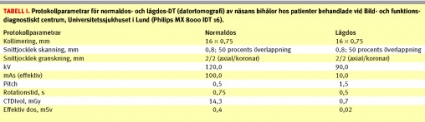 För att optimalt utnyttja doseffektiviteten hos en modern multidetektorskanner som vår 16-snittsapparat »Philips Mx 8000 IDT 16« utvecklade vi ett särskilt protokoll för frågeställningen rinosinuit. Målsättningen var att utföra denna undersökning med patienten i ryggläge, på kortast möjliga tid och med låg stråldos. För att uppnå lägsta möjliga stråldos ändrades de stråldosdeterminerande protokollparametrarna (kV, mAs, pitch och rotationstid) i vårt standardprotokoll för näsans bihålor så långt apparatens inställningsmöjligheter medgav. Tabell I visar de viktigaste parametrarna i vårt standardprotokoll respektive lågdosprotokoll för ansikte/bihålor.