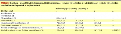 Bedömbarheten av de större bihålorna (maxillar-, frontal- och sfenoidalsinus) uppfattades i samtliga fall av som mycket god (grad 1). Bedömbarheten av etmoidalsinus var inte i något fall sämre än grad 2. För den frontonasala recessen och infundibulum var bedömbarheten endast i några fall sämre än grad 2 och inte i något fall sämre än grad 3. Även för dessa små strukturer bedömdes sålunda samtliga undersökningar som diagnostiska. Avgränsbarheten av den mediala orbitaväggen försämrades då angränsande etmoidalceller var utfyllda av mjukvävnad, och den bedömdes i flera fall av en av radiologerna som inte diagnostisk (grad 4).