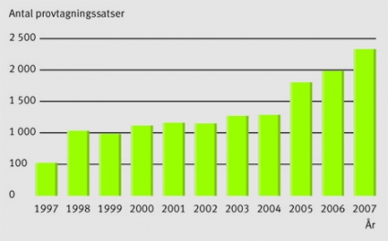 Under 2006 levererades knappt 2000 provtagningssatser, och 2007 ökade leveranserna med 17 procent till drygt 2300 (Figur 1). Två markanta ökningar noterades under den gångna 10-årsperioden. Den första, 1998, sätts i samband med den förenklade provtagningssats som då lanserades. Den andra, 2005, sätts i samband med förändrad sexualbrottslagstiftning.