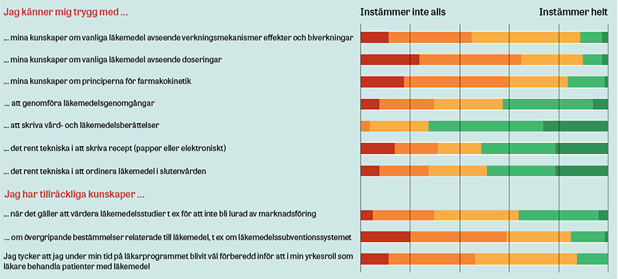 Totalt 10 (12 procent) studenter instämde i att de under sin tid på läkarprogrammet blivit väl förberedda inför att i sin yrkesroll som läkare behandla patienter med läkemedel, och 34 (42 procent) kände sig trygga med att genomföra en enkel läkemedelsgenomgång.