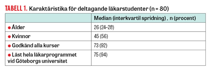 Av de 129 studenter som var registrerade på den aktuella kursen deltog 80 (62 procent) i kunskapstestet (Tabell 1). Även om medianåldern på 26 år var densamma hos dem som deltog respektive inte deltog i testet, var deltagarna signifikant yngre (22–41 år jämfört med 23–50 år; P = 0,04, Mann–Whitney U-test). Könsfördelningen skilde sig inte; 56 procent respektive 54 procent var kvinnor.