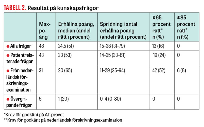 I kunskapstestet ingick 48 frågor av flervalstyp, varav 31 kom från den nederländska förskrivningsexaminationen. I 12 av de sistnämnda frågorna bytte vi ut läkemedel till sådana som är vanliga i Sverige. Vi författade också 17 frågor själva. Totalt 43 av frågorna handlade om läkemedelsbehandling i patientarbetet (läkemedelsval, biverkningar, farmakodynamik, farmakokinetik och läkemedelsberäkning). Fem av de frågor vi författat själva berörde läkemedelsbehandling på övergripande nivå (läkemedelsvärdering, subventionssystemet och farmakovigilans). Innehållet i frågorna validerades av en specialist i internmedicin.
