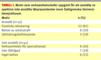 Sammanlagt 27 verksamhetschefer (40 procent) uppgav att de anställt läkarassistenter. Som motiv angavs rekryteringsskäl och behov av arbetskraft sommartid (93 procent). De verksamhetschefer som inte anställt läkarassistenter angav som skäl att de ansåg att verksamheten var för specialiserad eller att de inte kontaktats (Tabell I). Sammanlagt 13 verksamhetschefer (19 procent) angav att det fanns riktlinjer för tjänstgöringen. Riktlinjerna innebar i två fall inledande introduktionsvecka inför tjänstgöringen och i åtta fall att läkarassistenterna skötte sitt arbete under handledning. Kontakt med representant för medicinska fakulteten hade tagits i fyra fall.