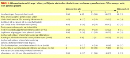 Över hälften av läkarassistenterna ansåg förbehållslöst att placeringen givit nyttiga erfarenheter inte bara inför kommande vikariat etc, utan också för kunskapsinhämtandet under resten av utbildningstiden (57 respektive 56 procent, Tabell II). Totalt 28 läkarassistenter (60 procent) angav att de hade fått ökad trygghet i läkarrollen och 16 (46 procent) att placeringen kommer att bidra till senare val av specialitet. Sammanlagt 39 studenter (81 procent) bedömde tjänstgöringen som helhet som positiv, och samtliga tyckte att tjänstgöringsformen bör finnas kvar.