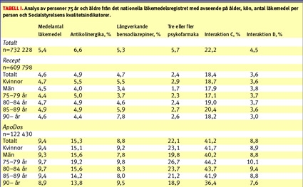 Förskrivningen av läkemedel till äldre är idag omfattande. De som är 75 år och äldre utgör ungefär 9 procent av befolkningen men konsumerar mer än en fjärdedel av alla läkemedel i Sverige [1]. Under 1990-talet ökade läkemedelsanvändningen i denna åldersgrupp från 3 till 5 preparat per person [2]. Ökningen var särskilt påtaglig hos personer i de särskilda boendeformerna, där de äldre idag i genomsnitt använder 10 preparat per person [1, 3, 4]. Resultat från en undersökning av äldre med dosexpedierade läkemedel (ApoDos) i Göteborg, liksom ett flertal studier av multisjuka äldre i Stockholm, visar emellertid att en lika omfattande läkemedelsanvändning idag kan förekomma hos äldre i eget boende [1, 5] – en grupp som kommer att växa framgent.