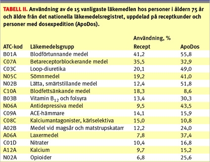 De tre vanligaste läkemedelsgrupperna bland de äldre var blodförtunnande medel, betareceptorblockerande medel och loop-diuretika (Tabell II). Flera läkemedelsgrupper, bla laxermedel, antidepressiva medel och smärtstillande medel, var vanligare hos äldre med dosexpedition, medan exempelvis blodfettsänkande medel, betareceptorblockerande medel och kalciumantagonister användes oftare av receptkunder.