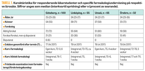 Vi genomförde en enkätundersökning vid läkarprogrammen i Göteborg, Linköping, Umeå och Örebro. Studenter som just gått den kurs som motsvarar invärtesmedicin inbjöds per e-post att besvara en elektronisk enkät. Information om omfattningen av undervisningen i farmakologi respektive klinisk farmakologi tillhandahölls av artikelförfattare som även bidrog till datainsamlingen på den aktuella orten. Övriga lärosäten med läkarprogram i Sverige gav positiva gensvar till studien som sådan men hade inte möjlighet att bidra med data.