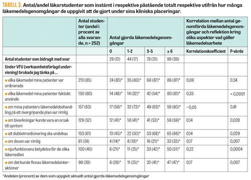 Totalt 113 studenter (45 procent) kände sig trygga med att göra läkemedelsgenomgångar och 156 (62 procent) med att göra läkemedelsberättelser (Tabell 2). Antal genomförda läkemedelsgenomgångar/läkemedelsberättelser var positivt korrelerat till hur trygg studenten upplevde sig vara med respektive arbetsmoment. Antalet genomförda läkemedelsgenomgångar korrelerade också positivt med studenternas reflektioner kring flera olika aspekter av patientens läkemedelsbehandling, till exempel följsamhet till ordinationer, dosering, biverkningar, njurfunktionens betydelse och läkemedelsinteraktioner (Tabell 3).