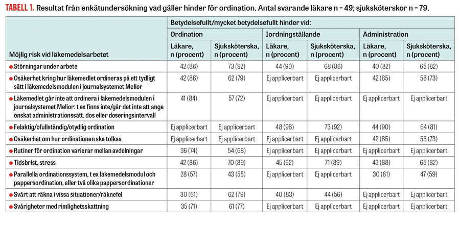 Resultaten från enkäten visar att felaktiga ordinationer, tidsbrist och störningar utgjorde de största hindren för sjuksköterskor vid iordningställande och administration. För läkarna utgjorde utformningen av journalsystemets läkemedelsmodul, tidsbrist, avbrott och varierande rutiner mellan avdelningar de största hindren vid ordination (Tabell 1).