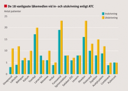 De flesta var ordinerade ett tämligen stort antal läkemedel vid ankomsten. Antalet varierade från 0 (två patienter) till 22 (en patient). Genomsnittligt antal läkemedel per patient vid inläggningen var 7,9, och vanligaste läkemedlen var furosemid, ASA (Trombyl) och paracetamol (Alvedon). Vid utskrivning var genomsnittligt antal läkemedel 10,1.