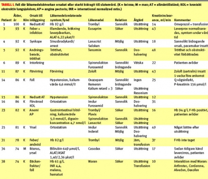 Hos 14 patienter bedömdes läkemedelsbiverkning vara ensam eller starkt bidragande orsak till inläggning (Tabell I). Hos fyra patienter som lades in på grund av yrsel, synkope och fallskada bedömdes inläggningen ha orsakats av ortostatism och hypotension sekundärt till läkemedel, i de flesta fall diuretika.