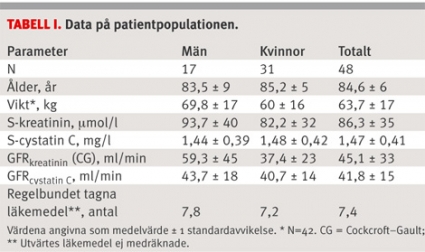 Av 59 boende ville 51 medverka i studien. Tre patienter föll bort, två på grund av inaktuell läkemedelslista och en på grund av svårigheter att ta prov. Av de återstående 48 personerna var 31 kvinnor och 17 män. Sex av de boende gick av praktiska skäl inte att väga, för dessa gick GFR inte att räkna ut från S-kreatinin. Deskriptiva data på inkluderade patienter återfinns i Tabell I.
