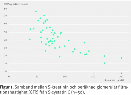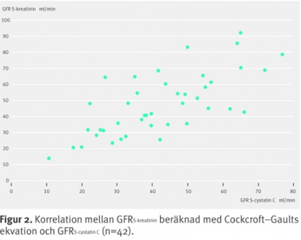 Om man räknar om S-kreatinin till GFR enligt Cockcroft–Gaults formel blev överensstämmelsen bättre. Korrelationen mellan GFR beräknat med hjälp av S-kreatinin och GFR från S-cystatin C var 0,71 (Figur 2).