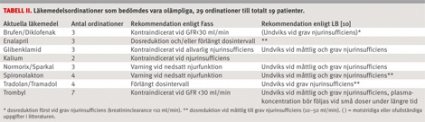 Ett antal teoretiskt olämpliga läkemedelsordinationer konstaterades (Tabell II), totalt 29 olika läkemedelsordinationer till 19 patienter inom 8 läkemedelsgrupper. Av dessa hade 15 patienter läkemedel som borde undvikits och 4 hade läkemedel där dosen borde reducerats. Utöver detta fanns 14 läkemedelsordinationer inom 5 läkemedelsgrupper till ytterligare 6 patienter där nedsatt njurfunktion var ett observandum. Sammanlagt 26 patienter av 48 var alltså berörda av teoretiskt olämpliga läkemedelsordinationer.