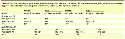 Det har från Läkemedelsverkets sida hävdats bla att de övre referensintervallsgränserna bör användas som beslutsgränser i primärvården [1]. Två aktuella undersökningar med mätning av N-terminalt proBNP ger emellertid vid handen påtagligt skilda värden för de övre referensintervallsgränserna hos medelålders och äldre [2, 3]. En genomgång av dessa studier har intresse inte bara för området natriuretiska peptider utan också för andra kvantitativa laboratoriemedicinska undersökningar.