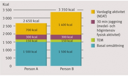 Det finns således påtagliga variationer mellan individer med olika rörelsemönster. Figur 2 illustrerar betydelsen av lågintensiv vardagsaktivitet, oberoende av MHFA, för energiomsättningen hos personerna A och B, som antas vara av samma kön, ha samma ålder och snarlik kroppssammansättning, vilket innebär en liknande basalmetabolism (antas vara 1 500 kcal). Båda joggar 30 minuter per dag med samma intensitet, vilket rimligen motsvarar 300 kcal.
