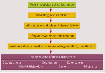 Nyligen presenterades en hypotes om att både fysisk inaktivitet och stillasittande, oberoende av andra kända riskfaktorer, ökar risken för ett antal sjukdomar som har en gemensam patogen mekanism (Figur 3) [16]. Till dessa sjukdomar räknas diabetes typ 2, hjärt–kärlsjukdom, depression, demens, koloncancer och bröstcancer, som kallas »the diseasome of physical inactivity«. Fysisk inaktivitet och långvarigt stillasittande leder till ansamling av visceralt fett via framför allt låg daglig energiomsättning och uteblivna myokinsvar från den inaktiva skelettmuskeln. Detta medför infiltration av makrofager i visceral fettväv, som i sin tur genererar en låggradig systemisk inflammation. Låggradig inflammation är den gemensamma patogena mekanismen för insulinresistens, ateroskleros, neuronal degeneration och tumörtillväxt, som i förlängningen ökar risken för sjukdomarna som räknas till diseasome of physical inactivity.