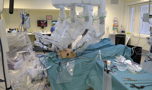 Figur 1. Robotassisterad operation för rektumcancer. Det bästa är att minimera tippningsvinkeln redan från början, inte under operationen. Tippningsvinkeln här är mindre än 20 grader. Foto: Olof Hallböök