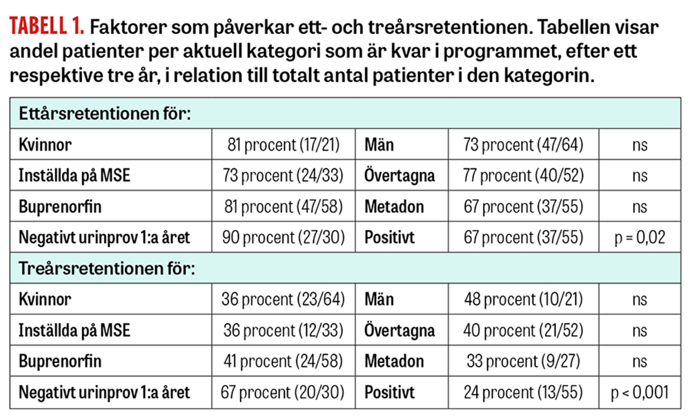Den totala ettårsretentionen var 75 procent (64/85), och den totala treårsretentionen var 39 procent (33/85). Det fanns ingen statistiskt säkerställd skillnad i retention mellan män och kvinnor, mellan dem som ställts in på Beroendecentrum och övertagna patienter eller mellan dem som behandlats med buprenorfin respektive metadon. Detta gällde för både ett- och treårsretentionen (se Tabell 1).