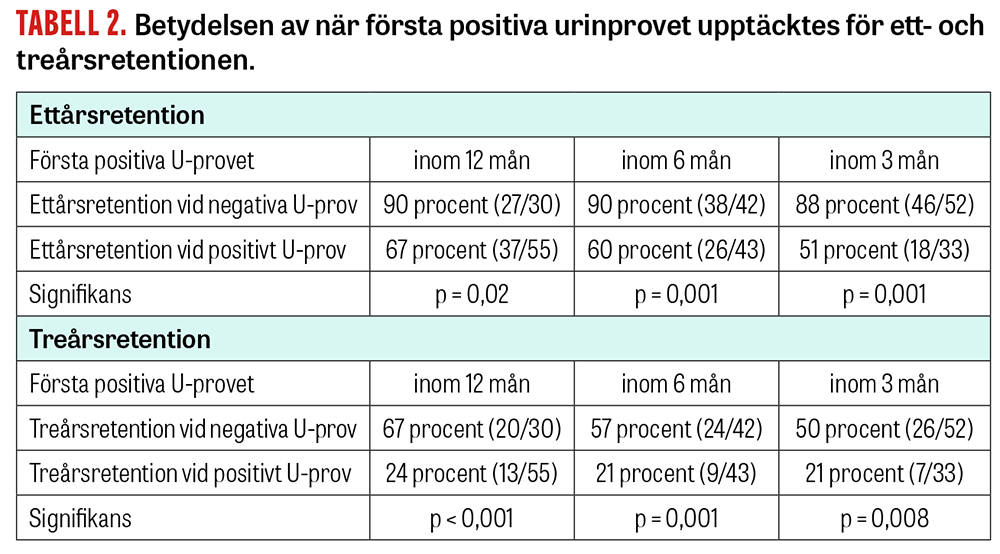 Av de faktorer vi undersökte var det bara positiva urinprov under första året som hade betydelse för både ettårs- och treårsretentionen (se Tabell 1 och 2). Detta överensstämmer med Davstads tidigare redovisade resultat [8].