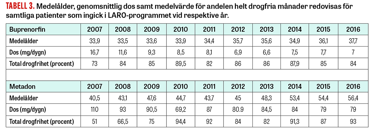 Opioidberoende är ett allvarligt sjukdomstillstånd med hög överdödlighet och lidande samt kraftig funktionsnedsättning. Psykosociala behandlingsmetoder fungerar inte tillfredsställande, och ca 75 procent av patienterna återfaller i heroinmissbruk inom ett år [1-3]. Läkemedelsassisterad rehabilitering av opioidberoende (LARO) med metadon och buprenorfin är en väldokumenterad och välfungerande behandlingsmetod. Målet med LARO är att öka möjligheterna att uppnå drogfrihet samt att ge ökad psykisk och fysisk hälsa, socialt fungerande samt minska dödlighet [4]. Ettårsretention brukar vara runt 50–84 procent, oavsett vilket av de två läkemedlen som används. Behandlingsutfallet förbättras om läkemedelsbehandling och psykosociala insatser kombineras. Ofrivillig utskrivning från LARO sker oftast på grund av sidomissbruk av andra droger än opioider [5-9]. Dokumenterad drogfrihet från icke-opioider före behandlingsstart förbättrar behandlingsresultatet [10]. Dödligheten hos opioidberoende patienter är hög, och opioider står för största delen av de narkotikarelaterade dödsfallen, även i Sverige [11-13].