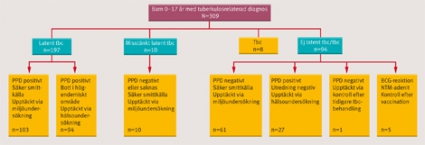 Avskriven tbc-misstanke. Hos 94 barn som remitterades kunde diagnosen latent tbc/tbc avskrivas (Figur 1). Av de 61 barn som genomgick miljöundersökning var inga smittade, trots att smittkällan i 30 procent utgjordes av direktpositiv tbc i barnets närhet (far, släkting, god vän till familjen). För 27 barn var PPD positivt, men barnen bedömdes ej ha latent tbc. Totalt 6 barn remitterades på grund av förstorad körtel efter BCG-vaccination, dubbelvaccination med BCG, körtel med icke-tuberkulösa mykobakterier (NTM-adenit) samt för kontroll efter tidigare tbc-behandling.