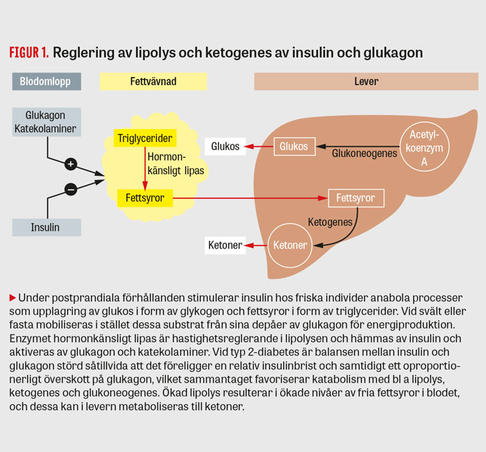 Hos patienter med typ 2-diabetes ses tidigt hämmad glukoskänslig insulinfrisättning [6]. Den relativa insulinbristen, oftast i kombination med perifer insulinresistens hos överviktiga individer, leder till defekt upptag av glukos i framför allt skelettmuskulatur och fettväv. Vid typ 2-diabetes, även av kort duration, råder också en oproportionerlig hyperglukagonemi [2, 4, 5, 7, 8]. Denna bidrar inte bara till hyperglykemi – främst genom att stimulera leverns glukosproduktion – utan även till att ketogenesen stimuleras genom glukagonets lipolytiska effekter (Figur 1).
