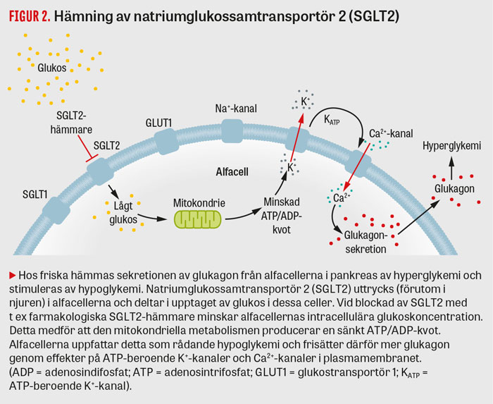 SGLT2-hämmare minskar reabsorptionen av glukos i njurarna, vilket medför ökad glukosuri, och glykemin reduceras därigenom oberoende av insulin [18, 19]. Denna läkemedelsklass har i vissa fall visats vara förknippad med normoglykemisk diabetisk ketoacidos hos patienter med såväl typ 1-diabetes som typ 2-diabetes vid olika stressituationer [20-22]. Mekanismerna för denna oväntade effekt började nystas upp efter att man funnit ökad endogen glukosproduktion hos patienter med typ 2-diabetes som behandlades med SGLT2-hämmaren dapagliflozin [23]. Man fann bl a att SGLT2 uttrycks i de glukagonproducerande alfacellerna och att hämning av SGLT2 kan resultera i ökad glukagonsekretion [24, 25] (Figur 2). Detta glukagonöverskott i förhållande till låga koncentrationer av insulin anses kunna inducera och driva ketosen hos patienter som behandlas med SGLT2-hämmare.