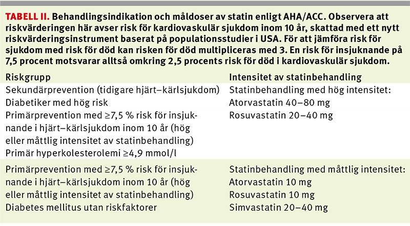 AHA/ACC-riktlinjerna vidgar indikationen för statiner, och för stora patientgrupper rekommenderas hög statindos. För primärprevention rekommenderas statinbehandling med hög eller måttlig intensitet åt alla med 7,5 procents risk för kardiovaskulär händelse under 10 år. Detta ska jämföras med definitionen av hög risk i europeiska riktlinjer, dvs över 5 procents risk för död (vilket skulle motsvara ungefär 15 procents risk för insjuknande).