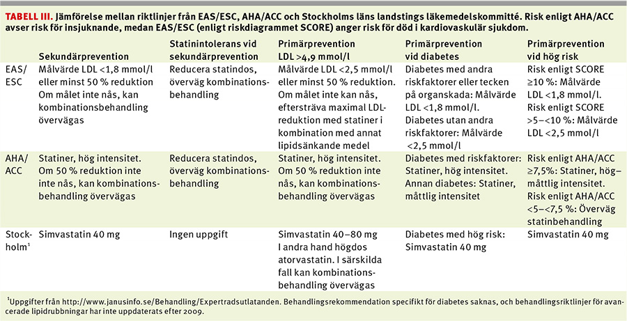Vilka är de praktiska konsekvenserna för läkare och patient av de olika riktlinjerna? Ett försök att jämföra behandlingen enligt rekommendationer i några typiska situationer summeras i Tabell III. Eftersom diskussionen kring måldos och målvärden i Sverige har förts utifrån framför allt rekommendationerna från Stockholms läns landstings läkemedelskommitté, har även dessa rekommendationer inkluderats i Tabell III. Som framgår är den praktiska handläggningen ofta likartad, oavsett om man följer riktlinjerna från EAS/ESC eller AHA/ACC.