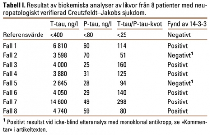 De ovan redovisade fallen är samstämmiga med nyligen publicerade data, som talar för att bestämning av T-tau/P-tau-kvot i likvor, som komplement till analys av 14-3-3-protein, kan öka möjligheten till säkrare diagnostik vid Creutzfeldt–Jakobs sjukdom [22]. Exakt gränsvärde för T-tau/P-tau-kvoten är svårt att fastställa. I Riemenschneiders och medarbetares studie hade samtliga 20 patienter med Creutzfeldt–Jakobs sjukdom en kvot över 78, och det högsta värdet vid andra demenssjukdomar var 12,8 [22].