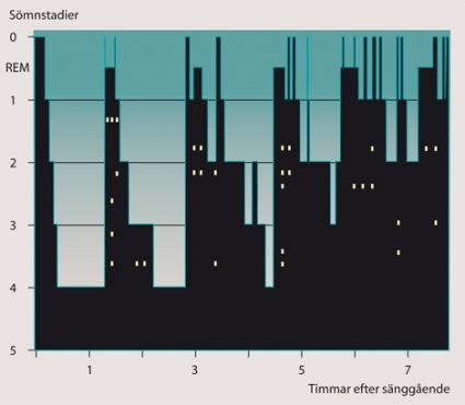 Sömn är en aktiv process av synkronisering av stora delar av hjärnbarkens neuron [3]. Låg frekvens och hög amplitud innebär hög synkroniseringsgrad, och här finns en stor del av sömnens återhämtande processer [4]. EEG-mönstret tillsammans med EMG (muskelspänning) och EOG (ögonrörelser) beskrivs i sömnstadier [5] och uppträder i en naturlig sekvens: sömnstadium 1, 2, 3 och 4 samt REM-sömn (rapid eye movement); sekvensen upprepas ungefär var 90:e minut (Figur 1). Stadium 3 och 4 (djupsömn, slow wave sleep – SWS) förekommer endast i de första cyklerna.