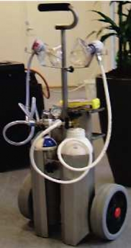 I den nu pågående multicenterstudien har vi tillsammans med AGA tagit fram en prototyp på en mobil enhet. Den mobila enheten består av en vagn med en tub 100 procent syrgas samt en tub med färdigblandad lustgas/syrgas (50 procent N2O/50 procent O2). På vagnen finns även inhalationsmasker, on-demand-ventil och pulsoximeter. Enheten saknar punktutsug och kan därför tills vidare användas bara på rum där adekvat gasevakuering finns.