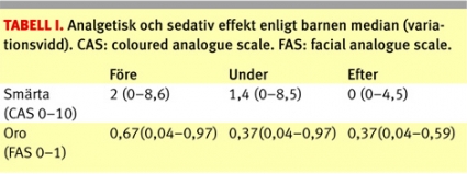 Beräknade medianvärden sjönk avseende smärta och oro under proceduren (ledinjektionen) jämfört med före, trots att barnet vid ledinjektionen förväntades ange högre värden för smärta och oro. Dock var endast reduktionen i FAS-värde statistiskt signifikant (P0,05). Se Tabell I.