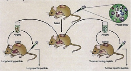 Vid angiogenes uttrycks under begränsad tid vissa markörer på endotelceller och pericyter. Dessa markörer är ofta tillväxtfaktorer och deras receptorer, eller celladhesionsmolekyler, och tillhörande ligander. Ett nytt sätt att leta efter dem är att använda korta och slumpmässigt konstruerade peptider, uttryckta på ytan av bakteriofager (fortsättningsvis kallade fager). Man talar ofta om att fagens yta är dekorerad med en peptid. En samling av fager, var och en med en unik peptid på ytan, kallas ett fagbibliotek (från engelskans phage display library). När de sprutas in intravenöst söker de sig via blodströmmen till sina mål och fäster om de hittar en komplementär peptidsekvens. Peptiden på fagens yta kan sedan identifieras. Framsteg har under senare tid gjorts för att dels konstruera slumpmässiga peptidbibliotek, dels förbättra screeningmetoderna, dvs metoder att hitta en unikt dekorerad fag i biblioteket eller i vävnaderna [11].
