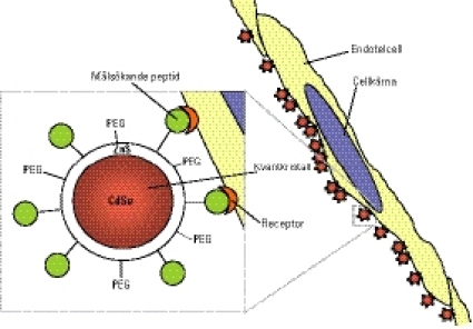 Målsökande peptider kan även användas till att bära nanopartiklar, dvs partiklar i nanostorlek (10 nm i diameter). Som bevis på att detta fungerar kopplades peptider till ytan på »quantum dots«, ytterst små kulor av halvledarmaterial. Dessa kulor har unika optiska egenskaper, tex stark luminiscens som kan ställas in på önskad våglängd som svar på ultraviolett ljus. Därmed kan partiklarna lokaliseras, vare sig det är i en biopsi eller i ett helt organ eller i en individ. Det lyser där de fastnat! Några av de peptider som används vid denna teknik är GFE, som binder sig specifikt till lungendotel, ovan nämnda F3, som binder till angiogenetiska endotelceller och olika typer av tumörceller [21], och LyP-1, som fäster vid lymfendotel i tumörer [27] (Figur 2).