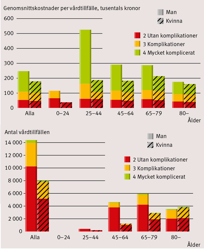 Genomsnittskostnader per vårdtillfälle för akut hjärtinfarkt var högre för män i alla åldersgrupper, 250 000 SEK mot 180 000 SEK (Figur 1). Sammanlagt hade männen 14 383 vårdtillfällen jämfört med kvinnornas 8 077. Åldersgruppen 25–44 år kostade mest, och männen dominerade med 510 000 SEK per vårdtillfälle mot kvinnornas 190 000 SEK. Kvinnor över 80 år hade fler vårdtillfällen och fler komplikationer jämfört med män. Vid mycket komplicerad DRG hade kvinnor en något längre vårdtid; män hade en genomsnittlig vårdtid på 9,8 dagar och kvinnor 10,1 dagar. Trots det var kostnaderna lägre för kvinnorna och högre för männen i denna åldersgrupp, 150 000 SEK jämfört med 180 000 SEK för männen.