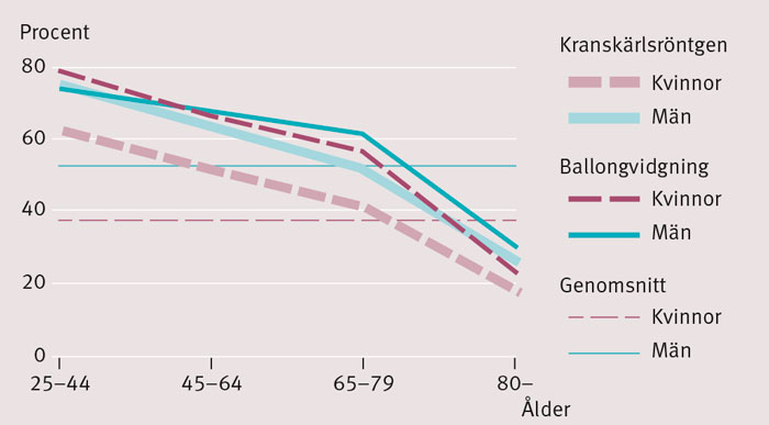 Ballongvidgning (PCI) utfördes oftare på män i alla åldrar och framför allt i åldrarna 24–44 år (Figur 2). I åldrarna 45–80 fick lika många kvinnor som män akut blodproppsupplösande medel och bypasskirurgi. Yngre kvinnor (25–44) fick oftare kranskärlsröntgen och hjärtekokardiografi (Figur 2). Inga signifikanta könsskillnader hittades när det gällde telemetriövervakning eller kranskärlsröntgen i övriga åldersgrupper.