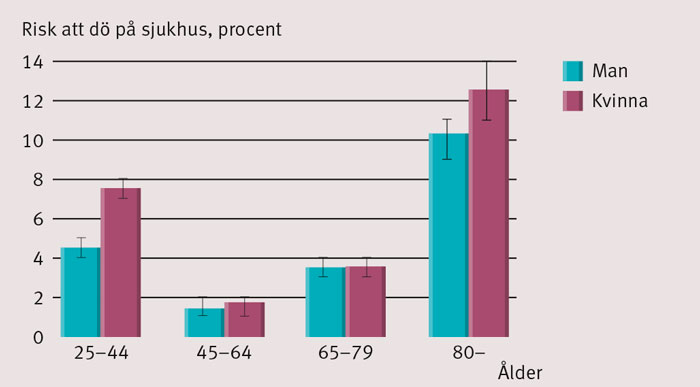 Figur 3. Risk att dö på sjukhus. Andel som avlidit under vårdtillfället (konfidensintervall 95 procent).