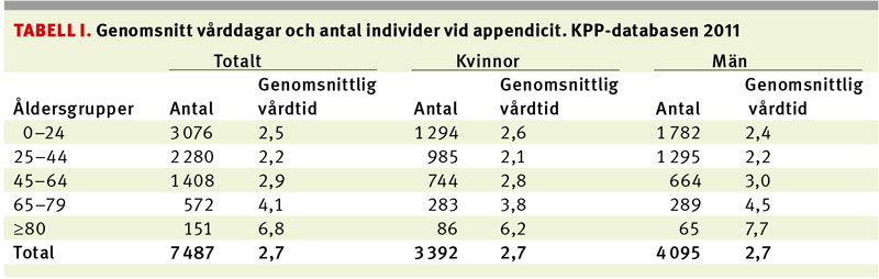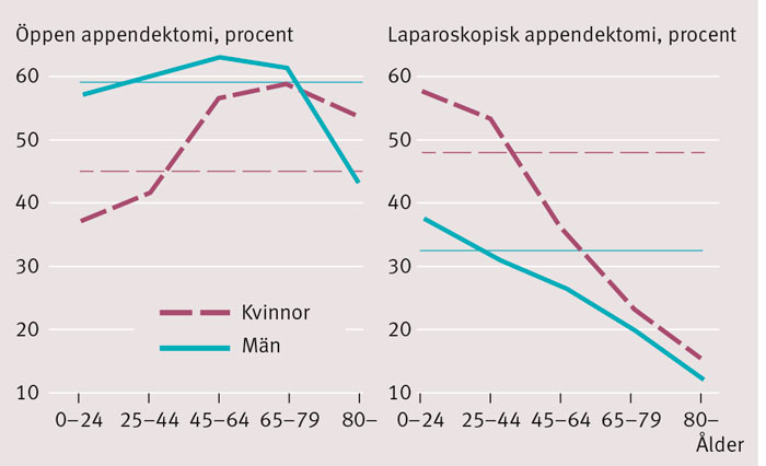 Av resultatet framgår att vården vid appendicit oavsett komplikationsgrad är dyrare för män i fyra av sex åldersgrupper. Vi kan här enbart spekulera om bakgrunden. En förklaring kan finnas i att valet av operationsmetoder vid appendicit tycks vara könsbaserat. Män opereras oftare med bukkirurgi medan kvinnor oftare opereras med laparoskopi. Könsskillnaden i operationsmetod styrks av en studie av 223 543 patienter som genomgått blindtarmsoperation åren 1987–2006 i Sverige avseende kort- och långtidsdödlighet med hänsyn till diagnos, kön, ålder, samsjuklighet, operationsmetod, sjukhusvolym och tidsperiod [13]. Studien visade att kvinnor signifikant oftare hade opererats med laparoskopi än med öppen bukkirurgi. Män hade signifikant oftare perforerad och flegmonös appendicit medan kvinnor oftare hade opererats, trots frisk blindtarm (skillnaderna är signifikanta, P<0,001), vilket även visats i andra studier [14].