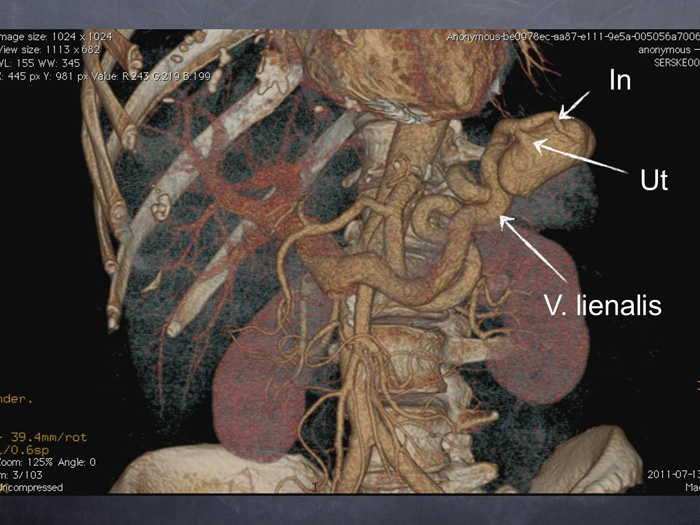 Bland de misstänkta diagnoserna fanns ändå en mer sannolik förklaring till blåsljudet, nämligen uppkomst av fistel i samband med mjältexstirpationen. Remiss utfärdades för undersökning med DT-angiografi med frågeställning: AV-fistel?