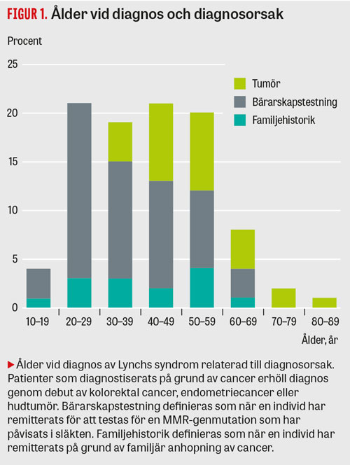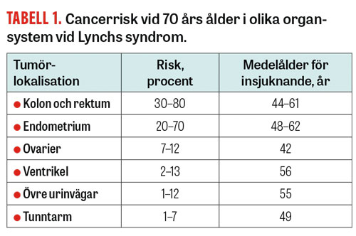 Lynchs syndrom är ett av flera ärftliga syndrom där livstidsrisken för kolorektal cancer är kraftigt förhöjd. Syndromet orsakas av mutationer i eller i nära anslutning till DNA-reparationsgenerna (mismatch repair, MMR) MLH1, MSH2, MSH6 och PMS2, vilka kodar för proteiner som ska reparera defekt basparning under DNA-replikationen (Fakta 1) [1]. Nedärvningen är autosomalt dominant, vilket innebär att risken för ett barn till en individ med Lynchs syndrom att ärva anlaget är 50 procent. Innan mutationsbestämning var möjlig baserades diagnosen ofta på enbart kliniska kriterier och benämndes ärftlig icke-polypös kolorektal cancer (HNPCC; hereditary nonpolyposis colorectal cancer).