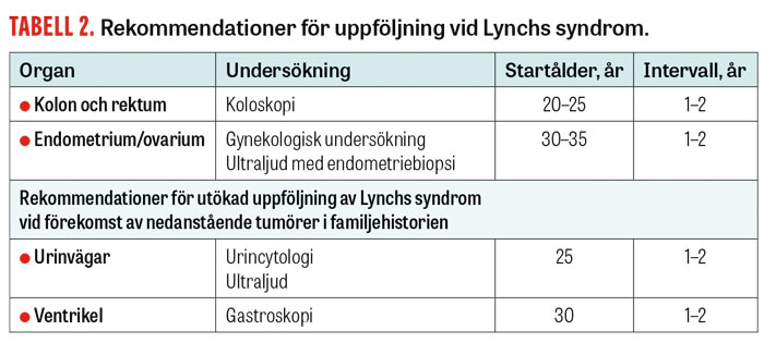 Efter onkogenetisk utredning remitteras individen vidare till en specialistmottagning för uppföljning av riskorgan, i första hand kolon, rektum och uterus (Tabell 2) [4]. Vid mottagningen informeras individen om möjliga kontrollprogram. Övriga riskfaktorer för cancer kartläggs, t ex rökning och övervikt.