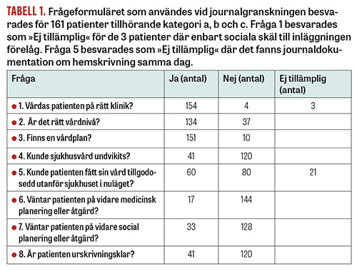 Frågeformulär. Utöver de 3 patienter vars inläggning enbart hade sociala skäl bedömdes inläggning på sjukhus ha kunnat undvikas hos 34 patienter som tillhörde kategori a och b (Tabell 1). Samtliga patienter i kategori a och b bedömdes vara i behov av sjukvård men således inte alltid av sjukhusvård. 60 patienter (37 procent) bedömdes kunna få sin vård tillgodosedd utanför sjukhuset, det vill säga hade vid tillfället för journalgranskningen inte behov av kontinuerlig övervakning, intravenöst tillförda läkemedel eller vätskor, kirurgi eller undersökning som kräver slutenvård, rehabilitering på strokeenhet eller observation av misstänkt allvarlig akut sjukdom. 21 patienter (12 procent) besvarade frågan med »Ej tillämplig« och det rörde sig i samtliga fall om patienter där journaltext angav att patienten planerades få gå hem samma dag (Tabell 1).